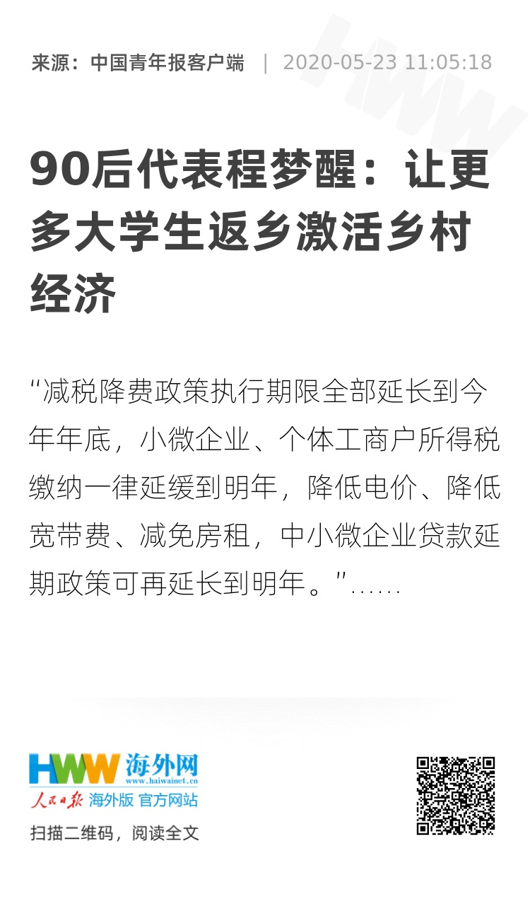“减税降费政策执行期限全部延长到今年年底,小微企业、个体工商户所得税缴纳一律延缓到明年,降低电价、降低宽带费、减免房租,中小微企业贷款延期政策可再延长到明年。”今天,政府工作报告中的这些内容让湖北代表团90后代表程梦醒感到振奋,她在调研时搜集了青年创业者、中小微企业等的困难和诉求,她感觉报告中相关内容是“想民之所想”。