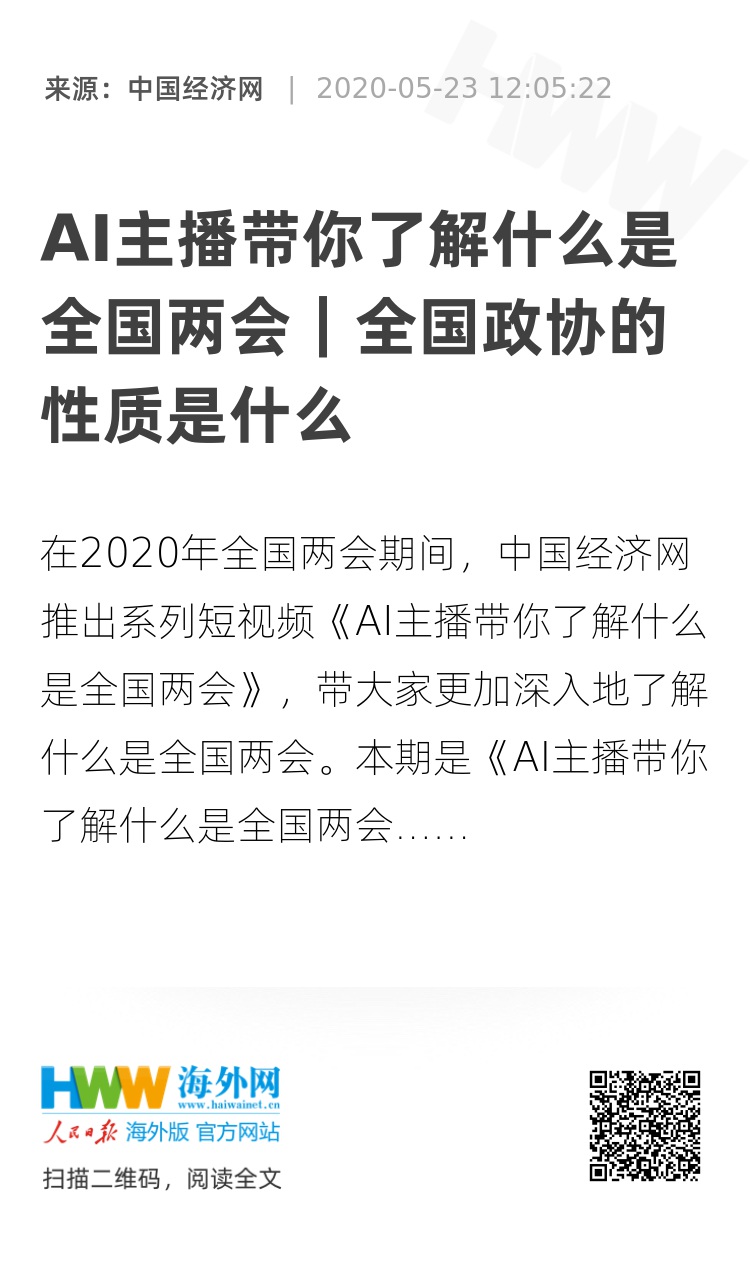 在2020年全国两会期间,中国经济网推出系列短视频《AI主播带你了解什么是全国两会》,带大家更加深入地了解什么是全国两会。本期是《AI主播带你了解什么是全国两会》的第五期,为大家讲解全国政协的性质是什么。以下为文字实录: