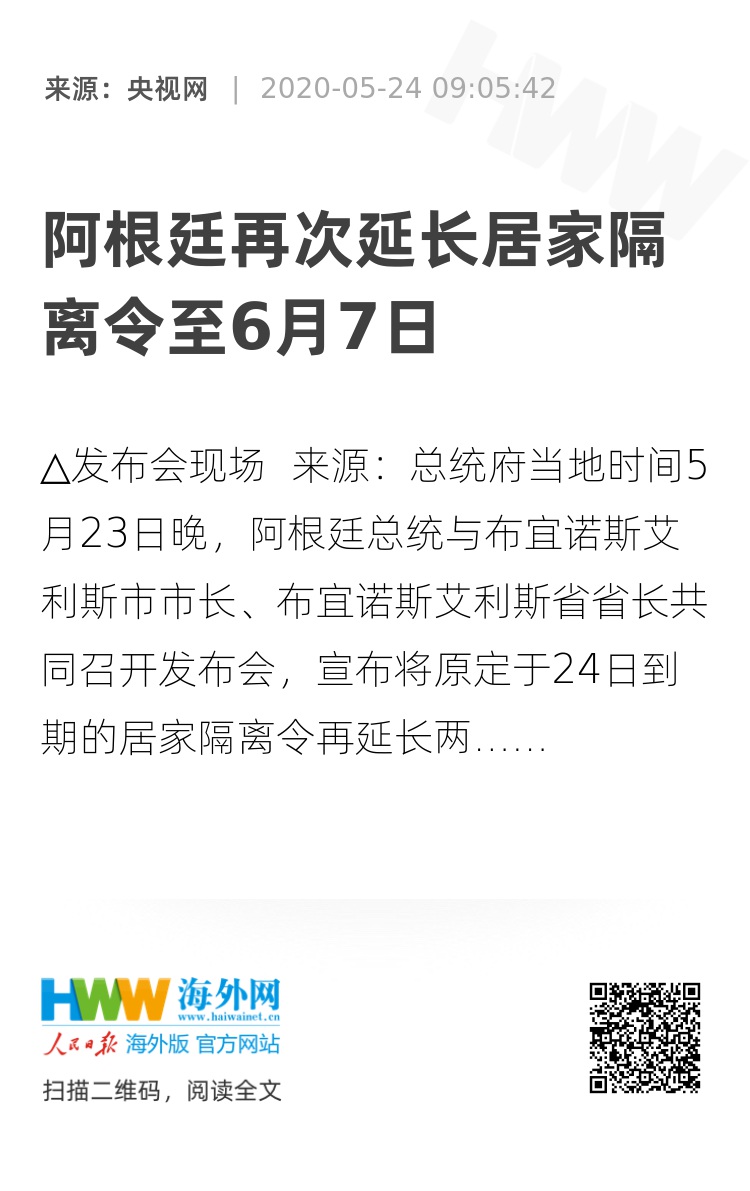 当地时间5月23日晚,阿根廷总统与布宜诺斯艾利斯市市长、布宜诺斯艾利斯省省长共同召开发布会,宣布将原定于24日到期的居家隔离令再延长两周至6月7日。