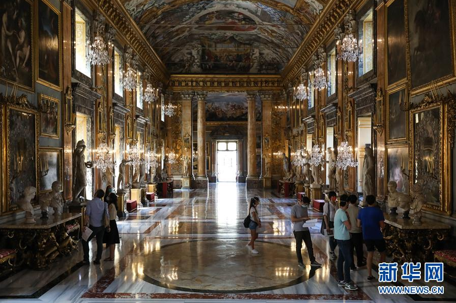5月23日,在意大利首都罗马,人们戴着口罩在科隆纳宫参观。当日,意大利罗马的科隆纳宫在疫情之后重新开放,参观者需要遵守测量体温、手部消毒、佩戴口罩、保持社交距离等严格的防疫规定。意大利民事保护部22日发布的数据显示,意大利现有新冠患者59322人,比前一天减少1638人;新增治愈患者2160人,累计治愈136720人。新华社记者程婷婷摄