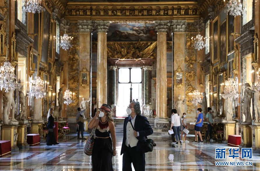 5月23日,在意大利首都罗马,人们戴着口罩在科隆纳宫参观。当日,意大利罗马的科隆纳宫在疫情之后重新开放,参观者需要遵守测量体温、手部消毒、佩戴口罩、保持社交距离等严格的防疫规定。意大利民事保护部22日发布的数据显示,意大利现有新冠患者59322人,比前一天减少1638人;新增治愈患者2160人,累计治愈136720人。新华社记者程婷婷摄