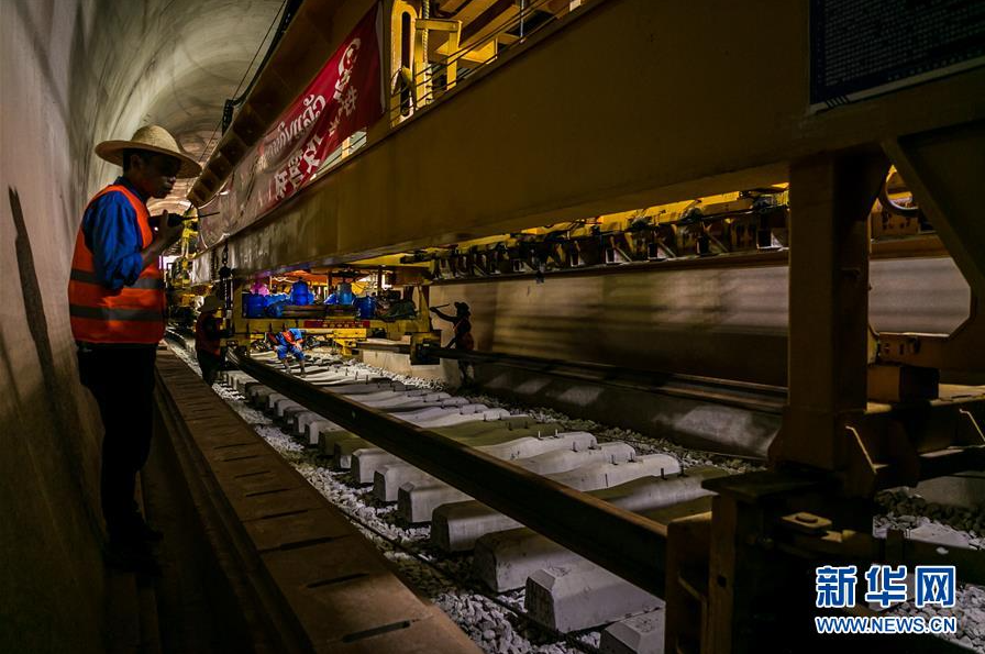 5月23日,在老挝万象省庚凯村隧道的中老铁路施工现场,中老两国工人协力铺轨。 随着每排14根轨枕按照规定距离平稳铺过庚凯村隧道,500米长钢轨随着牵引机稳准落定,中老铁路铺轨23日通过第一座隧道,从老挝首都万象一路向北。 新华社发(凯乔摄)