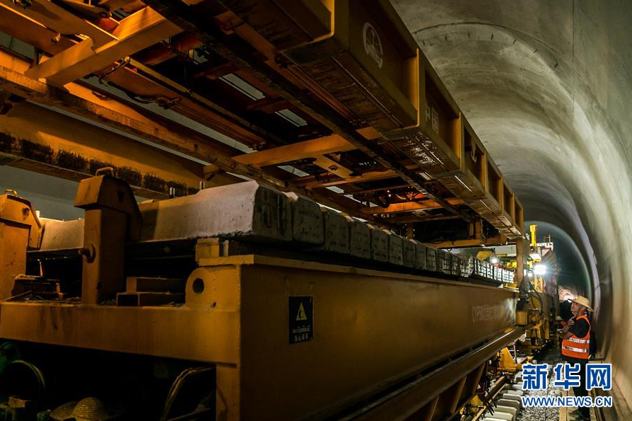 5月23日,在老挝万象省庚凯村隧道的中老铁路施工现场,中老两国工人协力铺轨。 随着每排14根轨枕按照规定距离平稳铺过庚凯村隧道,500米长钢轨随着牵引机稳准落定,中老铁路铺轨23日通过第一座隧道,从老挝首都万象一路向北。 新华社发(凯乔摄)