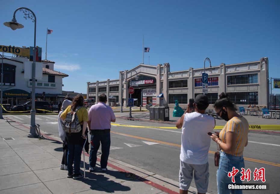 当地时间5月23日,美国旧金山知名景点渔人码头的一处鱼品加工和储存仓库燃起大火,火势一度殃及附近停泊的曾在二战期间服役的自由轮Jeremiah O’Brien号。经过约150名消防员及数十辆(艘)消防车(船)的救援,货轮仅外表受到一定损伤。消防部门有一人受伤,并在当地医院接受了治疗。图为市民在渔人码头附近关注火灾情况。 中新社记者 刘关关 摄