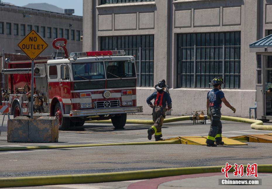当地时间5月23日,美国旧金山知名景点渔人码头的一处鱼品加工和储存仓库燃起大火,火势一度殃及附近停泊的曾在二战期间服役的自由轮Jeremiah O’Brien号。经过约150名消防员及数十辆(艘)消防车(船)的救援,货轮仅外表受到一定损伤。消防部门有一人受伤,并在当地医院接受了治疗。图为消防人员在码头实施灭火作业。中新社记者 刘关关 摄