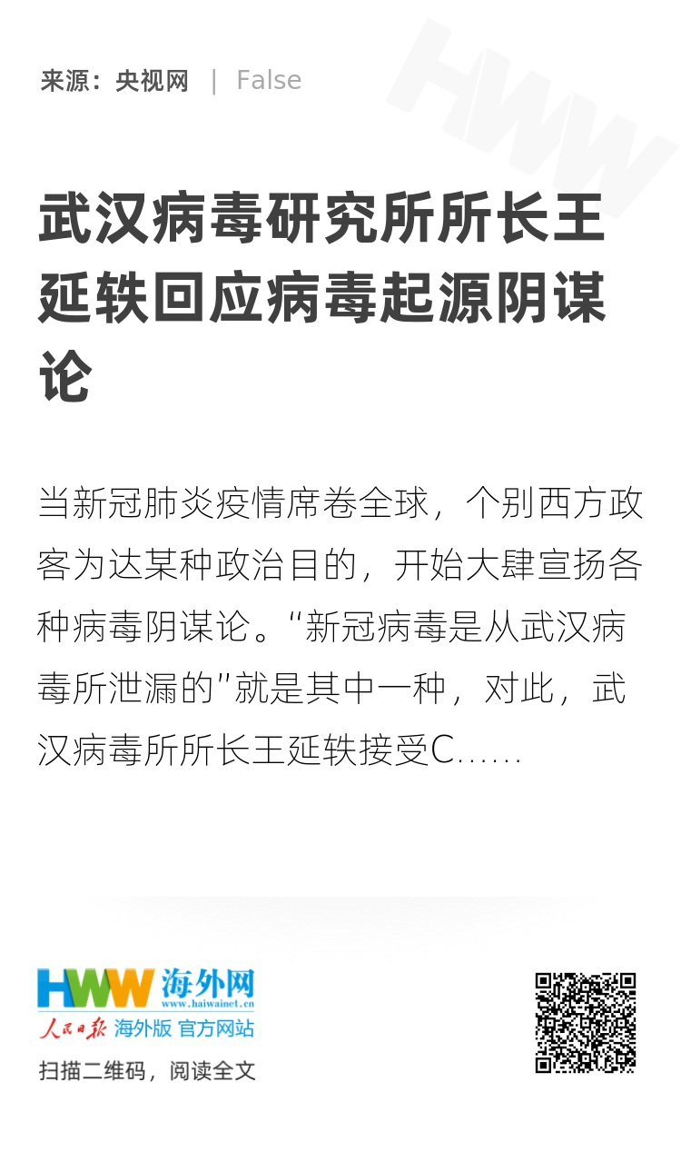 当新冠肺炎疫情席卷全球,个别西方政客为达某种政治目的,开始大肆宣扬各种病毒阴谋论。“新冠病毒是从武汉病毒所泄漏的”就是其中一种,对此,武汉病毒所所长王延轶接受CGTN专访,就一系列相关问题进行了回应。