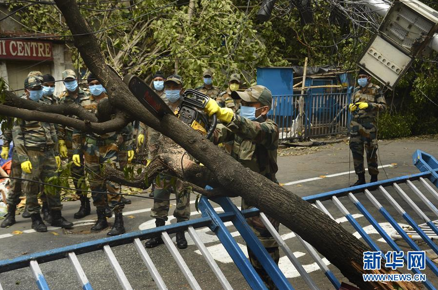 5月24日,在印度加尔各答,军事人员清理一处倒下的树木。 特强气旋风暴“安攀”本周早些时候重创印度西孟加拉邦,政府正在组织灾区清理,以恢复正常生活。 新华社发