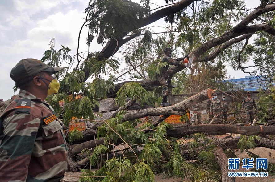 5月24日,在印度加尔各答,军事人员清理一处倒下的树木。 特强气旋风暴“安攀”本周早些时候重创印度西孟加拉邦,政府正在组织灾区清理,以恢复正常生活。 新华社发