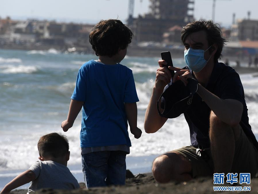 5月24日,在意大利首都罗马附近的拉迪斯波利,一名戴着口罩的男子给他的孩子拍照。 意大利民事保护部24日发布的数据显示,该国现有新冠患者人数比前一天减少1158人,降至56594人;新增治愈病例1639例,累计治愈140479例。 新华社发