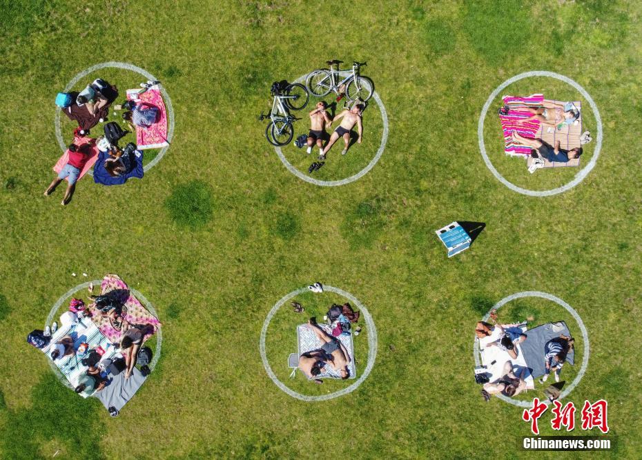 当地时间5月24日,美国旧金山市区的多洛雷斯公园在草坪上画出数百个圆圈,以敦促前来休闲娱乐的人们保持“社交距离”。 中新社记者 刘关关 摄