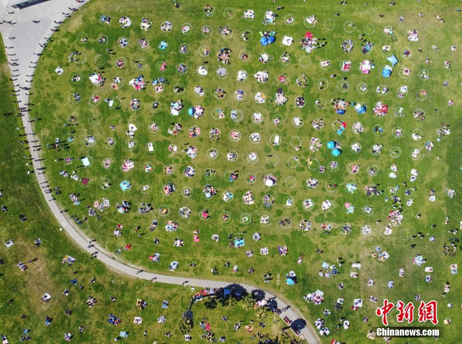 当地时间5月24日,美国旧金山市区的多洛雷斯公园在草坪上画出数百个圆圈,以敦促前来休闲娱乐的人们保持“社交距离”。 中新社记者 刘关关 摄