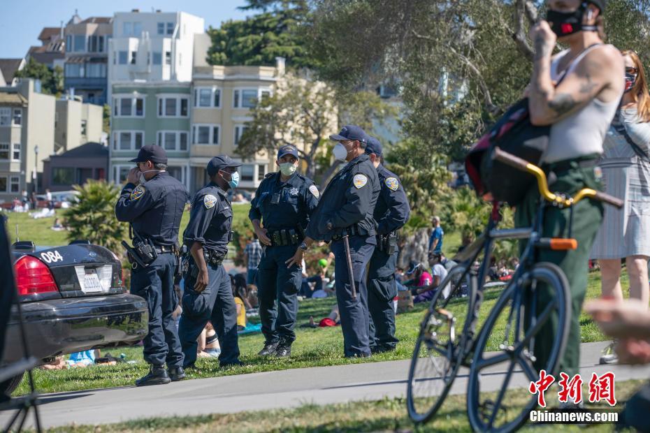 当地时间5月24日,美国旧金山警员在多洛雷斯公园执勤。很多美国人选择在户外庆祝将士阵亡纪念日长周末,公共卫生官员担忧,大型聚会可能导致疫情再次暴发。 中新社记者 刘关关 摄