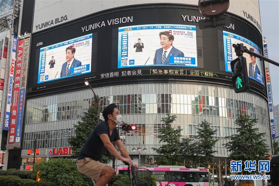 5月25日,在日本东京新宿,戴口罩的骑行者经过一处电子屏。电子屏上播放着日本首相安倍晋三宣布日本全国解除紧急状态的新闻画面。 日本首相安倍晋三25日晚宣布,日本全国解除紧急状态。此前日本47个都道府县中已仅剩东京都、北海道等5个维持紧急状态。 新华社记者 杜潇逸 摄