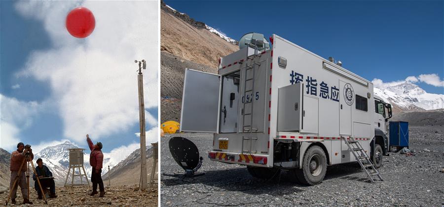 拼版照片:左图为1975年6月9日,我国气象工作者在珠穆朗玛峰脚下的高山气象站收集气象资料。新华社记者程至善摄 右图为2020年5月25日拍摄的珠峰大本营气象应急保障车,西藏自治区气象局气象专家在这里与后方气象专家进行天气会商。新华社记者普布扎西摄