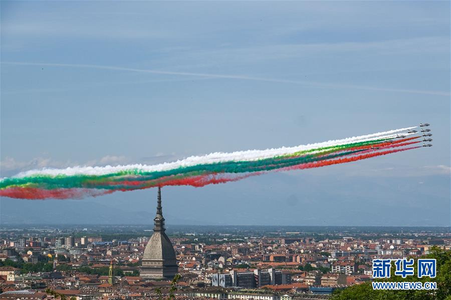 5月25日,意大利空军“三色箭”飞行表演队从都灵上空飞过。 从25日起,意大利“三色箭”飞行表演队在意大利多个城市举行飞行表演,庆祝即将到来的6月2日意大利“共和国日”,同时激励民众团结抗疫。 新华社发(费代里科·塔尔迪托摄)