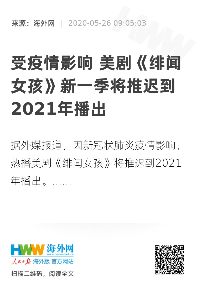 【海外网5月26日|战疫全时区】据外媒报道,热播美剧《绯闻女孩》因新冠状肺炎疫情将推迟到2021年。
