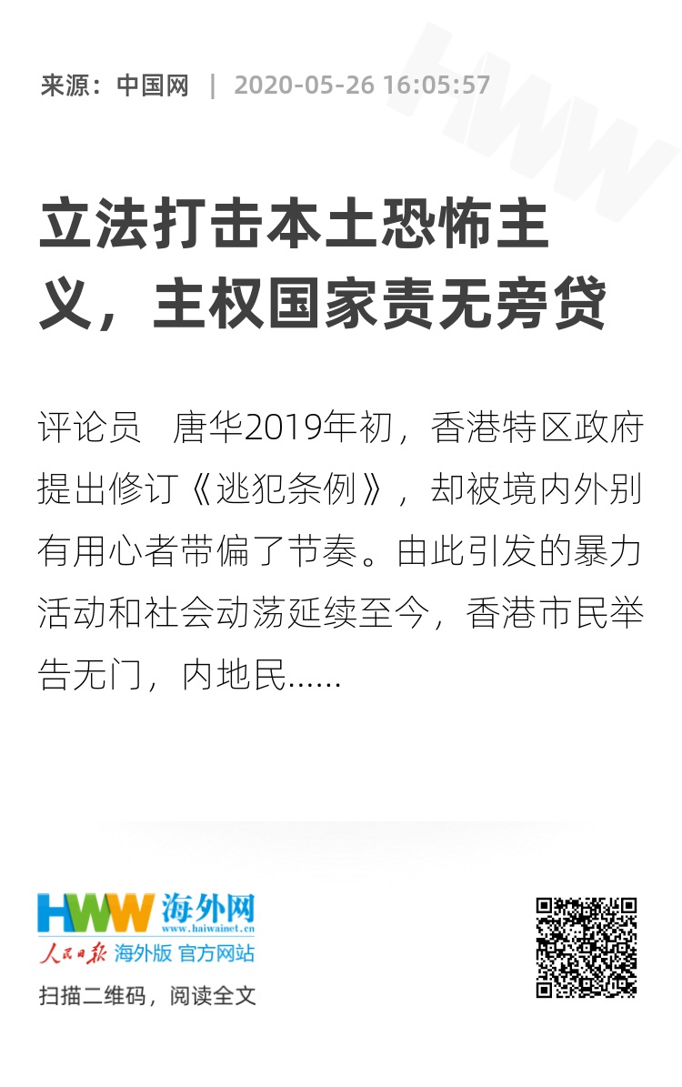 国家的长治久安,是包括香港市民在内的中国人民追求美好生活、实现各项基本权利的根本前提。在宪法和香港基本法的轨道上推进维护国家安全制度建设,加强维护国家安全工作,依法打击本土恐怖主义,还东方之珠以本来颜色,是民心所向、众望所归,也会得到全世界爱好和平的各国政府和人民的理解和赞同。