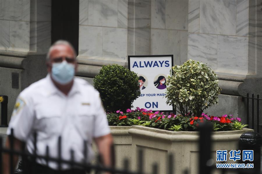 5月26日,美国纽约证券交易所外竖立着佩戴口罩的提示牌。 新华社记者 王迎 摄