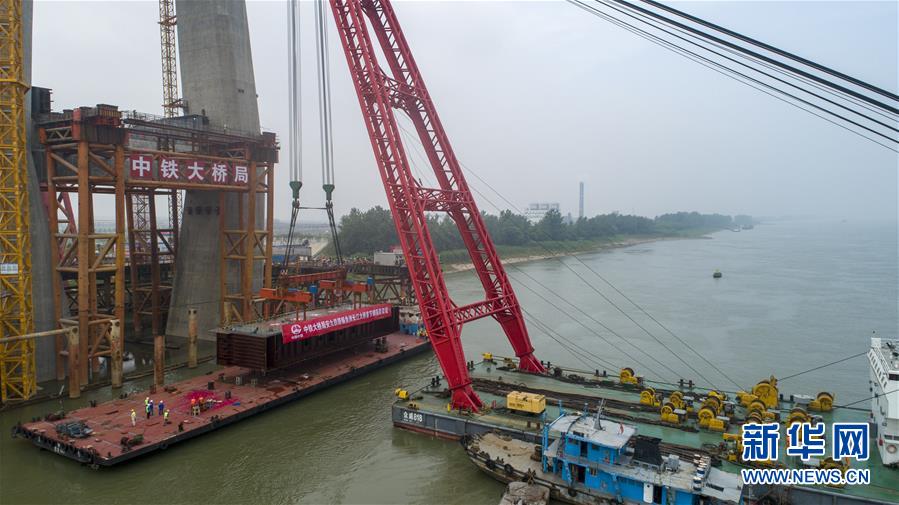 5月26日拍摄的鳊鱼洲长江大桥钢箱梁架设现场。新华社发