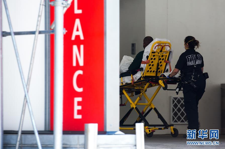5月26日,在美国纽约,医护人员将一名患者送入急诊室。 美国约翰斯·霍普金斯大学26日发布的新冠疫情最新统计数据显示,截至26日20时32分(北京时间27日8时32分),美国确诊病例达1680625例,死亡病例为98902例。 新华社发(郭克 摄)