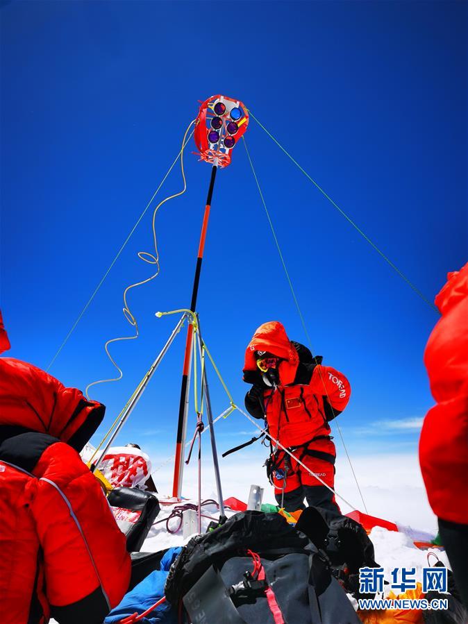 5月27日,2020珠峰高程测量登山队队员在峰顶开展测量工作。新华社特约记者 扎西次仁 摄