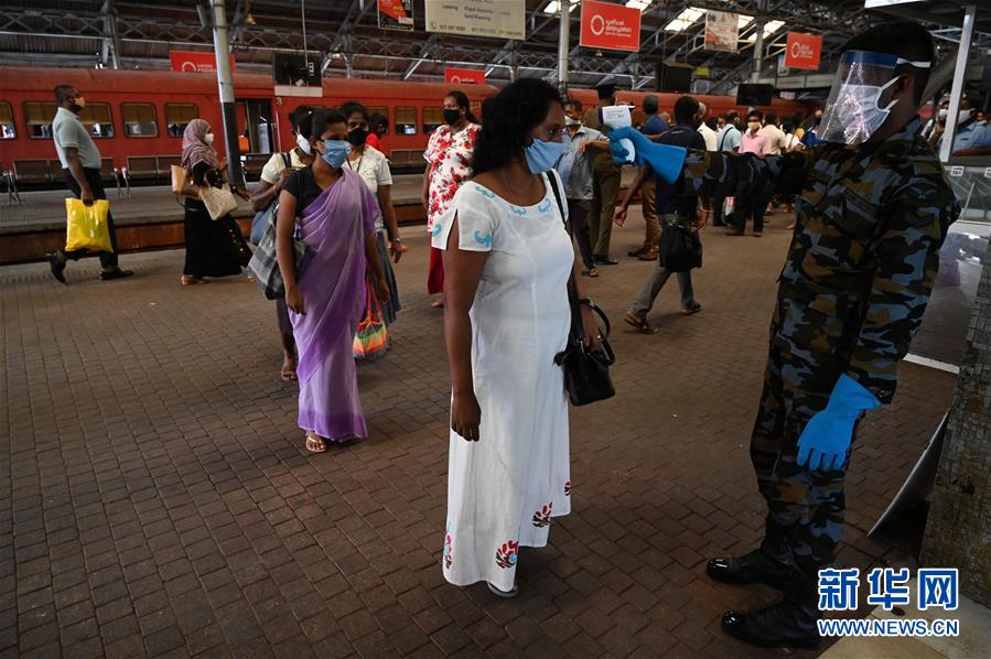 5月26日,在斯里兰卡首都科伦坡,火车站的工作人员为人们测量体温。 新华社发(哈普拉彻奇摄)