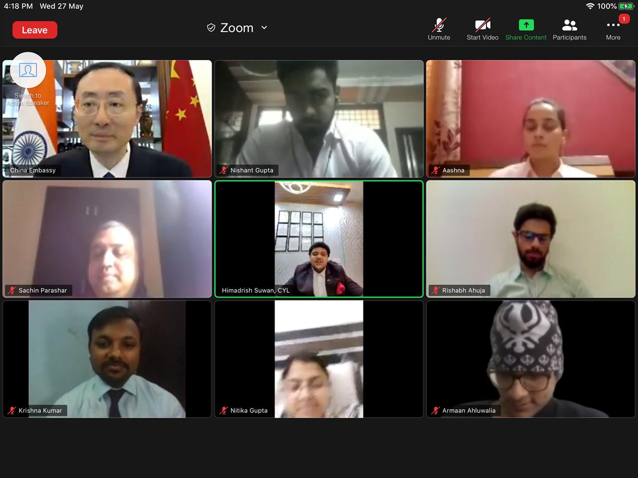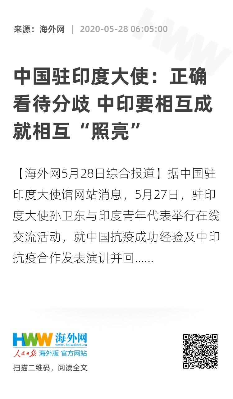 【海外网5月28日综合报道】据中国驻印度大使馆网站消息,5月27日,驻印度大使孙卫东与印度青年代表举行在线交流活动,就中国抗疫成功经验及中印抗疫合作发表演讲并回答与会青年提问。印青年领袖联合会主席苏万主持,来自全印各地的杰出青年代表以及新华社、印亚洲国际新闻通讯社、《印度时报》、WION电视台、The Print等中印媒体记者共70余人参加。