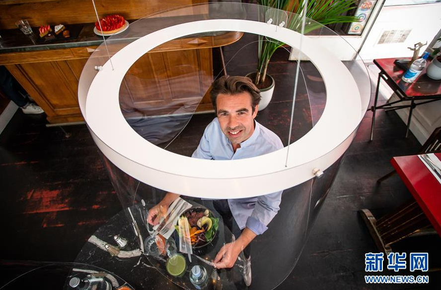 5月27日,在法国巴黎一家餐馆,客人在保护罩内用餐。近日,法国设计师克里斯托夫·热尔尼贡研发了一款易于安装、清洁和消毒的保护罩,旨在保护人们疫情期间在餐馆、酒吧、酒店等公共场所用餐时的安全。新华社发(奥雷利安·莫里萨尔摄)