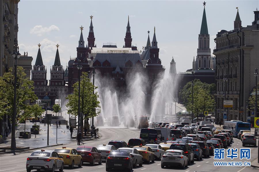 5月28日,在俄罗斯首都莫斯科市中心,市政车辆进行消毒作业。新华社发(亚历山大摄)