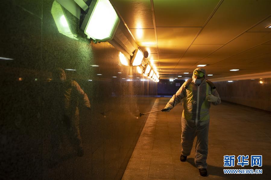 5月28日,在俄罗斯首都莫斯科市中心,工作人员进行消毒作业。