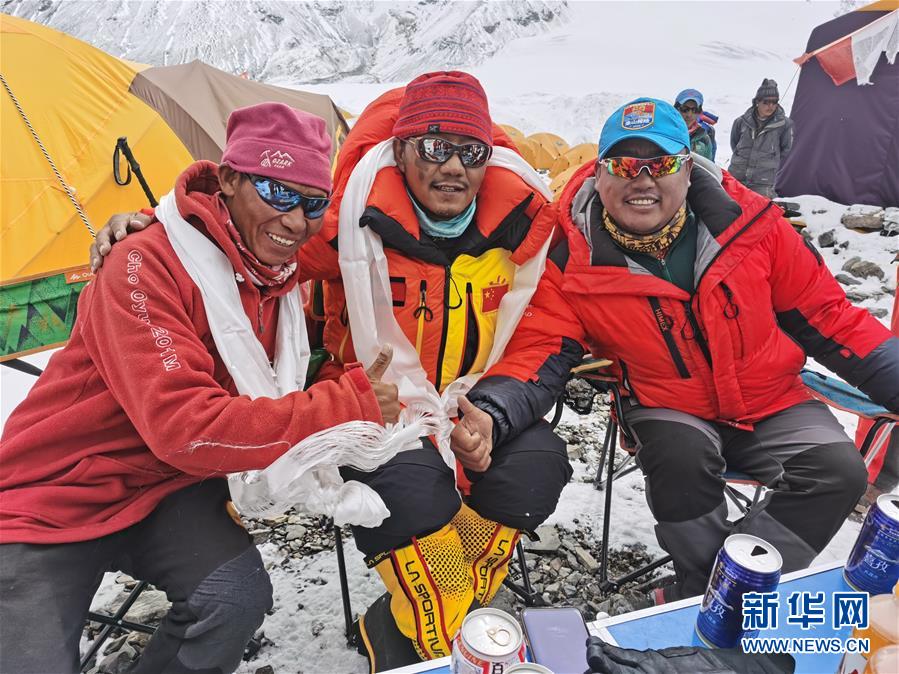 5月28日,测量登山队员返回前进营地后庆祝登顶。 当日,中国2020珠峰高程测量登山队安全返回海拔6500米的前进营地。5月27日,测量登山队成功登顶珠穆朗玛峰并完成峰顶测量等工作。 新华社特约记者 边巴 摄