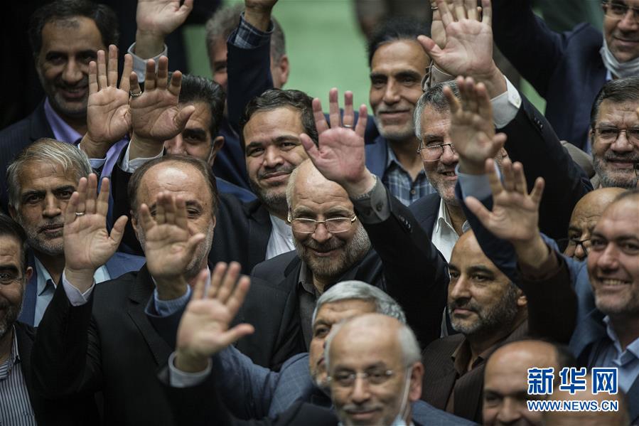 5月28日,在伊朗首都德黑兰,新一届伊朗伊斯兰议会议长卡利巴夫(中)与议员一起挥手致意。 新一届伊朗伊斯兰议会28日选举前伊斯兰革命卫队空军司令、前德黑兰市长穆罕默德·巴吉尔·卡利巴夫为议长。伊朗伊斯兰议会设有290个席位,任期通常为四年。 新华社发(艾哈迈德·哈拉比萨斯摄)