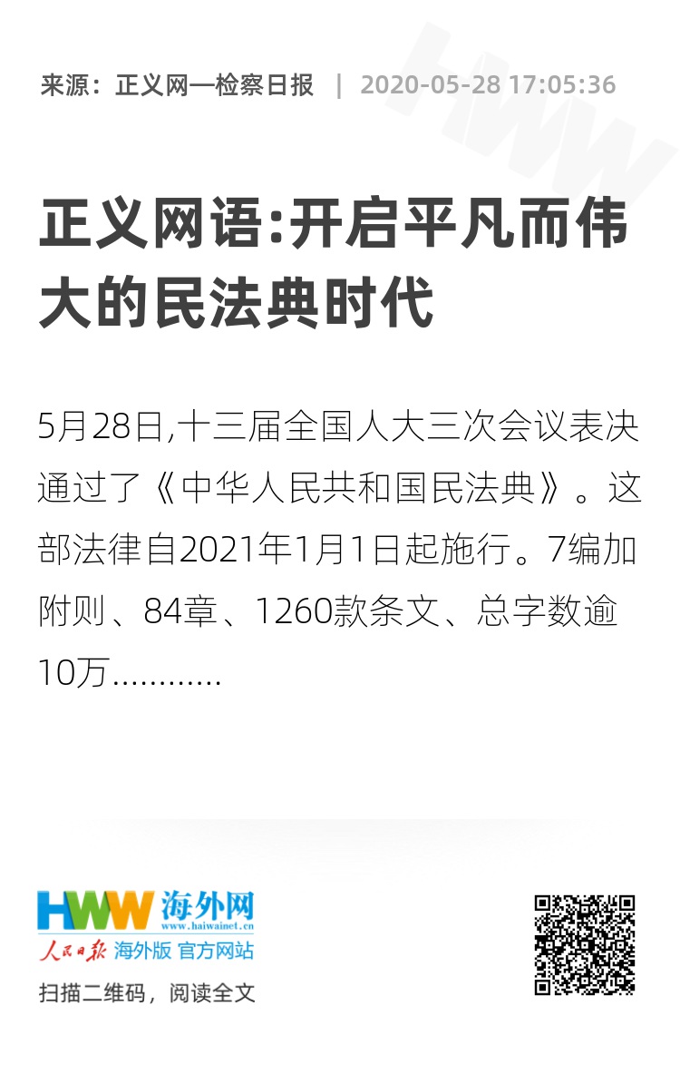 5月28日,十三届全国人大三次会议表决通过了《中华人民共和国民法典》。这部法律自2021年1月1日起施行。7编加附则、84章、1260款条文、总字数逾10万……民法典不仅是我国条文数最多的一部法律,也成为新中国成立以来第一部以“法典”命名的法律,中国开启了“民法典时代”。