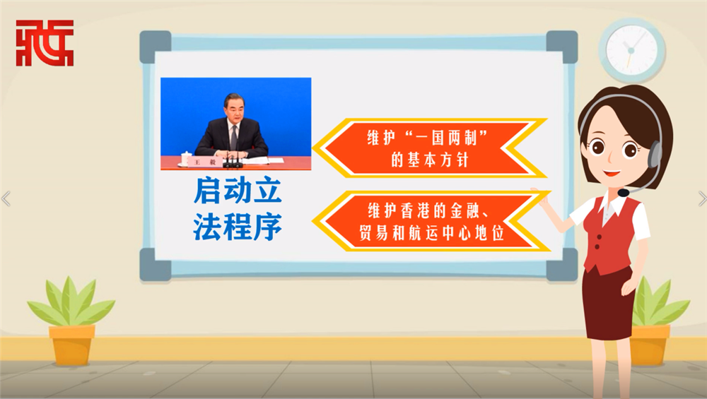 国务委员兼外交部长王毅在人大记者会上表示,《决定》通过之后,将启动立法程序,这将使香港有更加完备的法律体系、更加稳定的社会秩序、更加良好的法治和营商环境,有利于维护“一国两制”的基本方针,有利于维护香港的金融、贸易和航运中心地位。