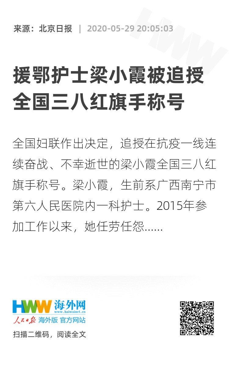 全国妇联作出决定,追授在抗疫一线连续奋战、不幸逝世的梁小霞全国三八红旗手称号。