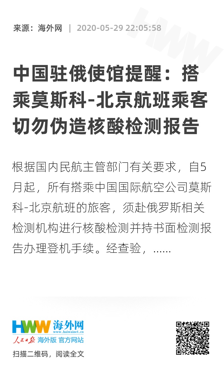 根据国内民航主管部门有关要求,自5月起,所有搭乘中国国际航空公司莫斯科-北京航班的旅客,须赴俄罗斯相关检测机构进行核酸检测并持书面检测报告办理登机手续。经查验,有个别中国公民伪造核酸检测报告并持伪造件登机,故意隐瞒病情,造成不良影响和后果。这种公然违反中国民航主管部门规定的做法,对同航班其他乘客和机组人员的健康安全造成很大危害,给国内防疫工作带来干扰,是极不道德、极不负责的行为,中俄主管部门将依法依规追究有关人员相应责任。