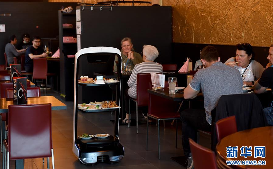 5月28日,在奥地利维也纳一家亚洲餐厅内,机器人给顾客上菜。 维也纳的一家亚洲餐厅于疫情期间重新营业后,更多利用机器人上菜,以减少服务员和顾客之间的非必要接触。 新华社记者 郭晨 摄