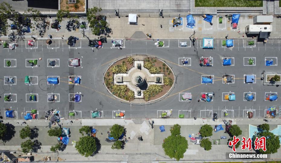 旧金山市政厅对面建无家可归者营地 画方框确保“社交距离”