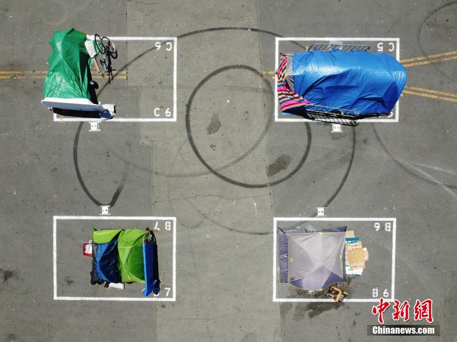 旧金山市政厅对面建无家可归者营地 画方框确保“社交距离”