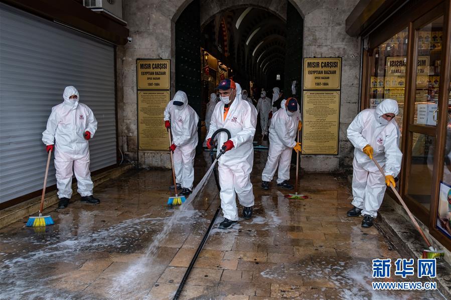 5月28日,工作人员在土耳其伊斯坦布尔的香料市场内进行消毒工作。 土耳其总统埃尔多安当日宣布土耳其将取消对国内旅行的限制,并从6月1日起允许餐馆、咖啡馆、公园、海滩和健身房重新开放。香料市场将于6月1日重新开放。 新华社发(亚辛·阿克居尔摄)
