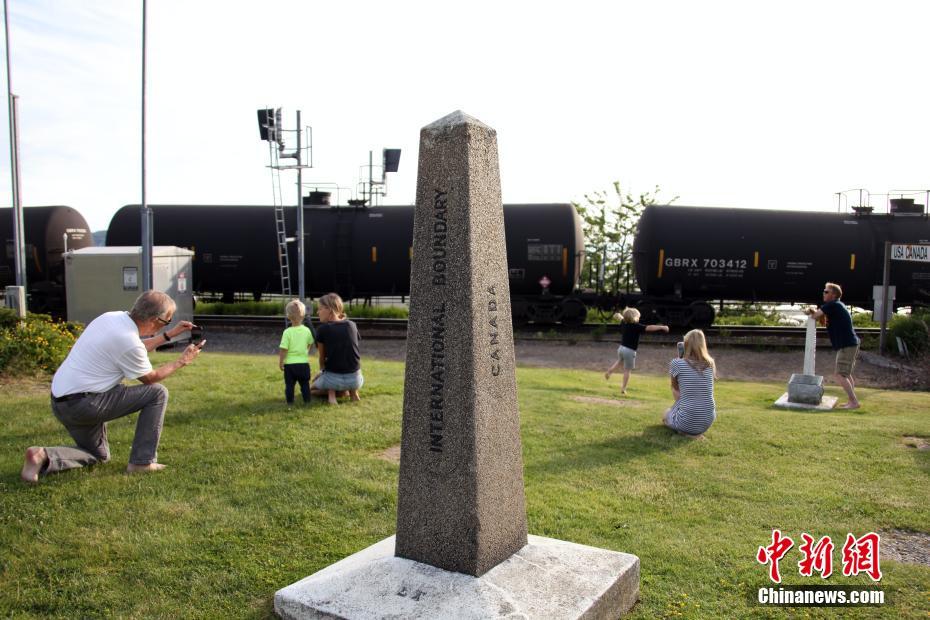 当地时间5月28日,加拿大不列颠哥伦比亚省(又译卑诗省)素里市(Surrey)加美边境口岸的和平拱门公园,一列从美国驶入加拿大境内的货运火车吸引当地民众目光。加美两国边境口岸目前仍实施禁止“非必要跨境旅行”的有条件封关措施,但基本物资的跨境运输不受影响。 中新社记者 余瑞冬 摄