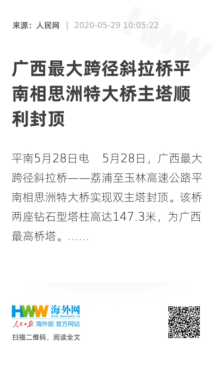 人民网平南5月28日电 5月28日,广西最大跨径斜拉桥——荔浦至玉林高速公路平南相思洲特大桥实现双主塔封顶。该桥两座钻石型塔柱高达147.3米,为广西最高桥塔。塔柱耸立于浔江两岸,呈比翼齐飞之势,大气磅礴。