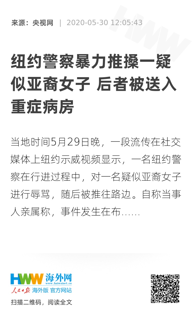 31802737,.纽约警察暴力推搡一疑似亚裔女子 后者被送入重症病房,.2020-05-30 12:59:43,.204309,.陈亚楠