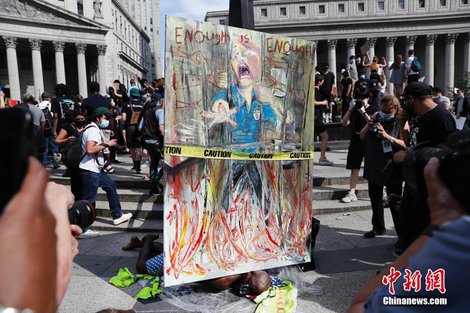 当地时间5月29日,纽约上千民众聚集在曼哈顿佛利广场,抗议明尼苏达州明尼阿波利斯市非裔男子乔治·佛洛依德遭警察暴力执法致死。图为一名男子利用画作抗议。 中新社记者 廖攀 摄