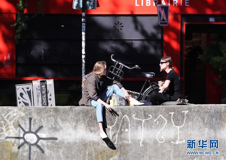 5月29日,在法国巴黎,人们在圣马丁运河旁晒太阳。 新华社记者 高静 摄