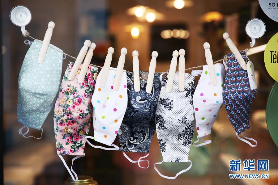 5月29日,在法国巴黎,一家面包店同时售卖手工织布口罩。 新华社记者 高静 摄