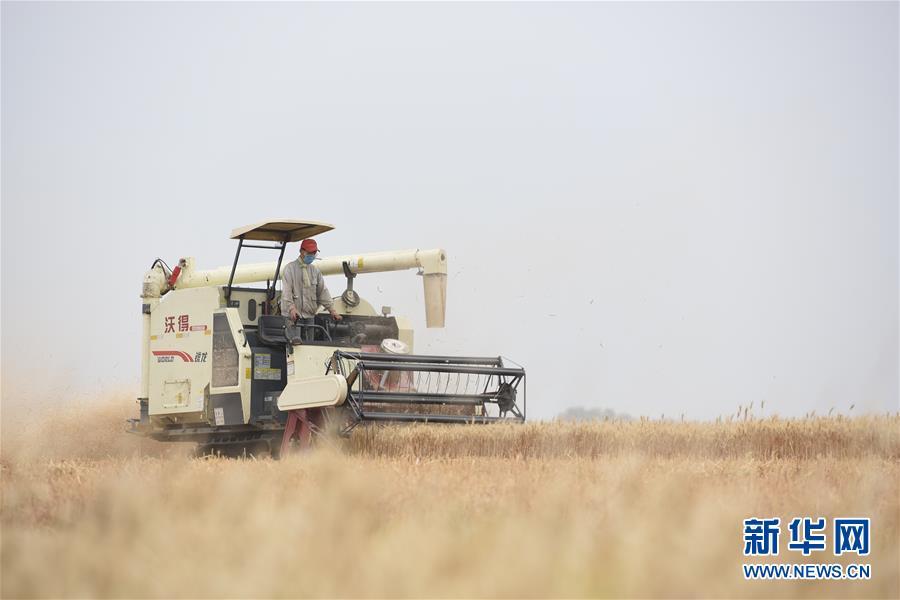 5月29日,江苏省淮安市洪泽区三河镇农民驾驶农机在农田里收割小麦。 新华社发(张建 摄)