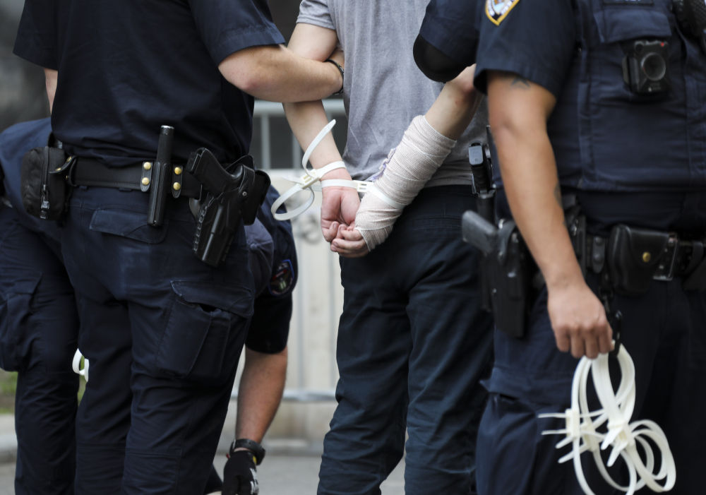 ↑5月29日,在美国纽约,警察逮捕一名抗议者。新华社记者 王迎 摄