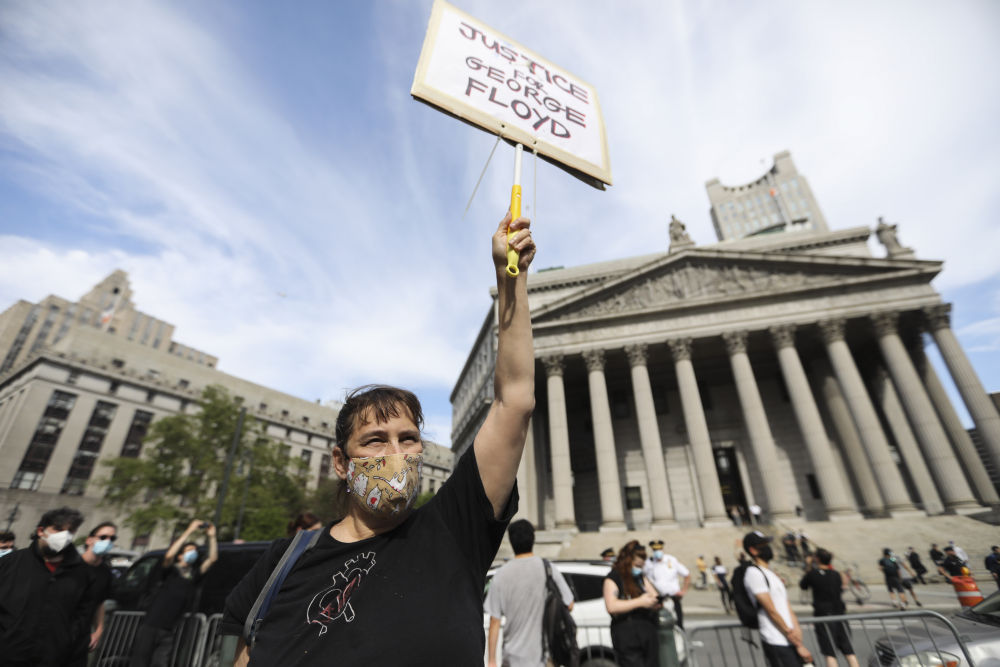 ↑5月29日,在美国纽约,一名抗议者打出抗议标语。