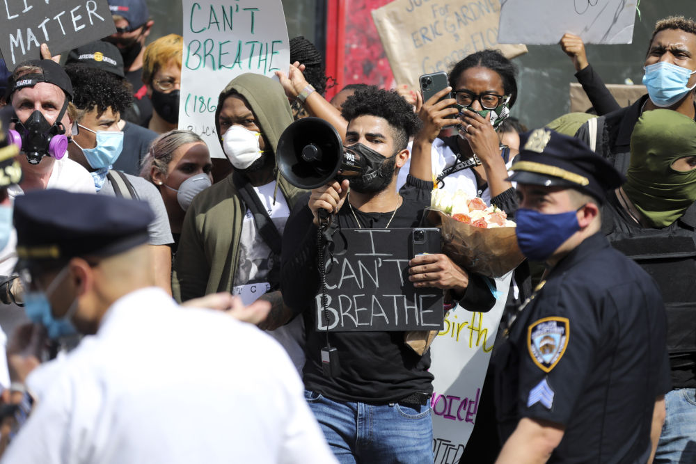 ↑5月29日,在美国纽约,抗议者与警察对峙。